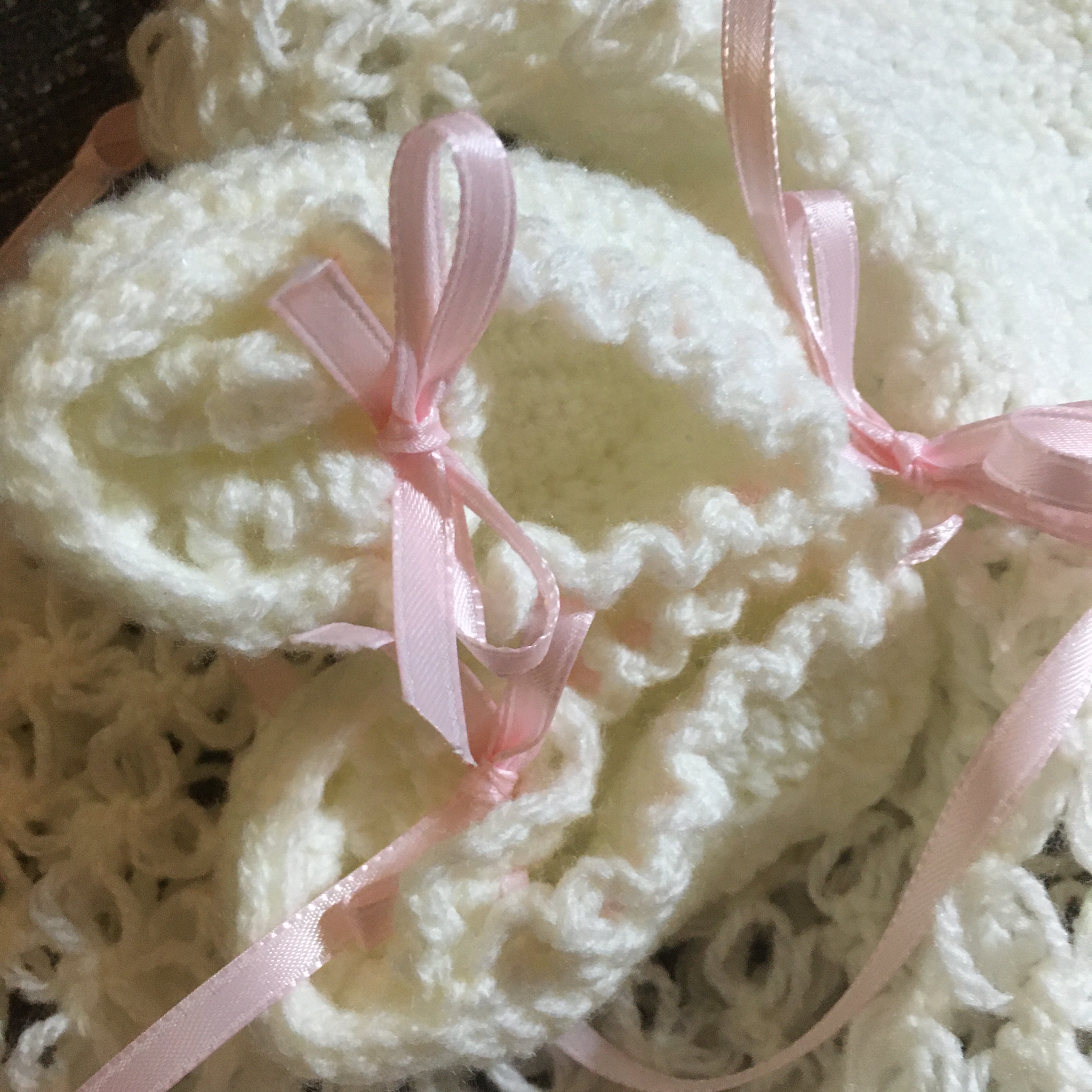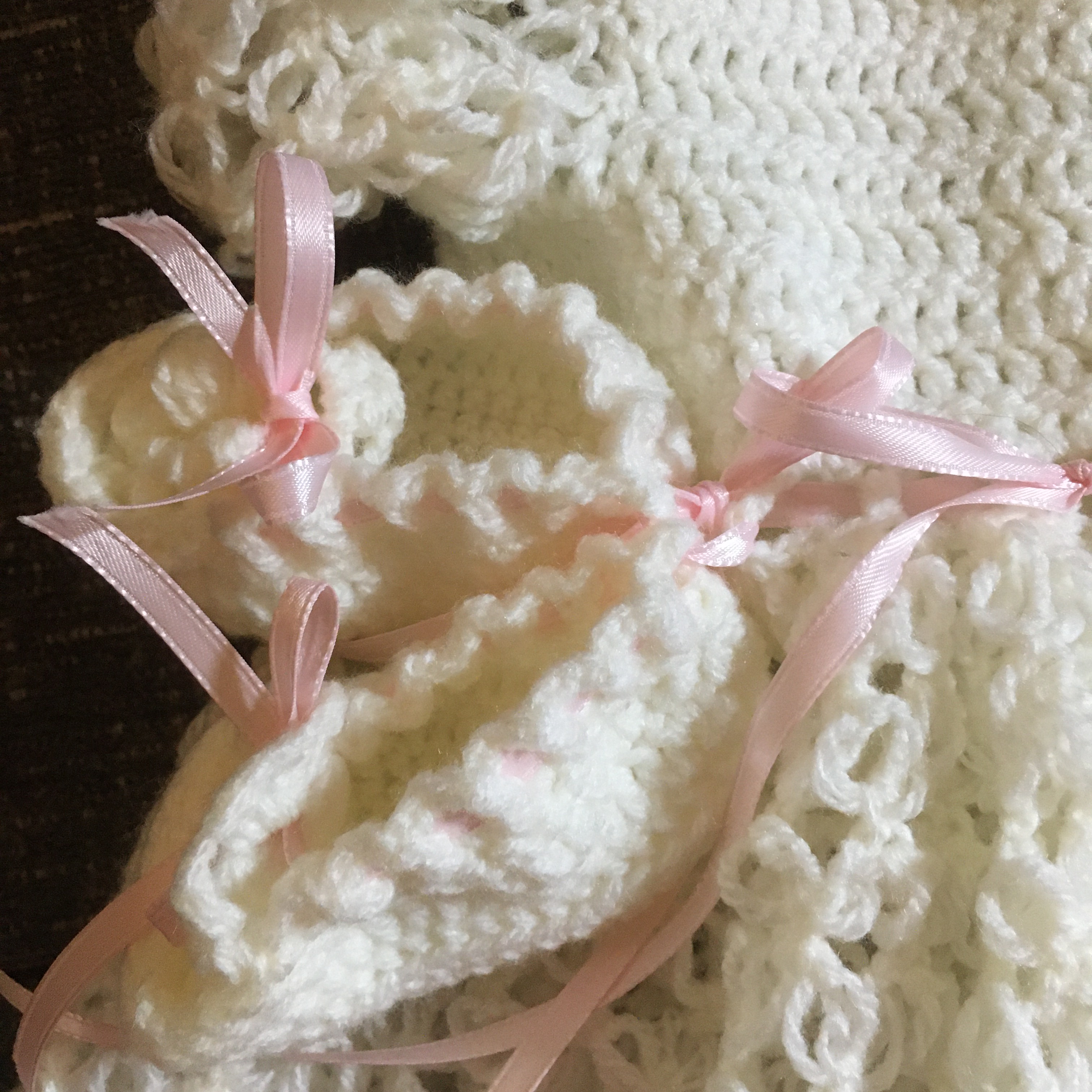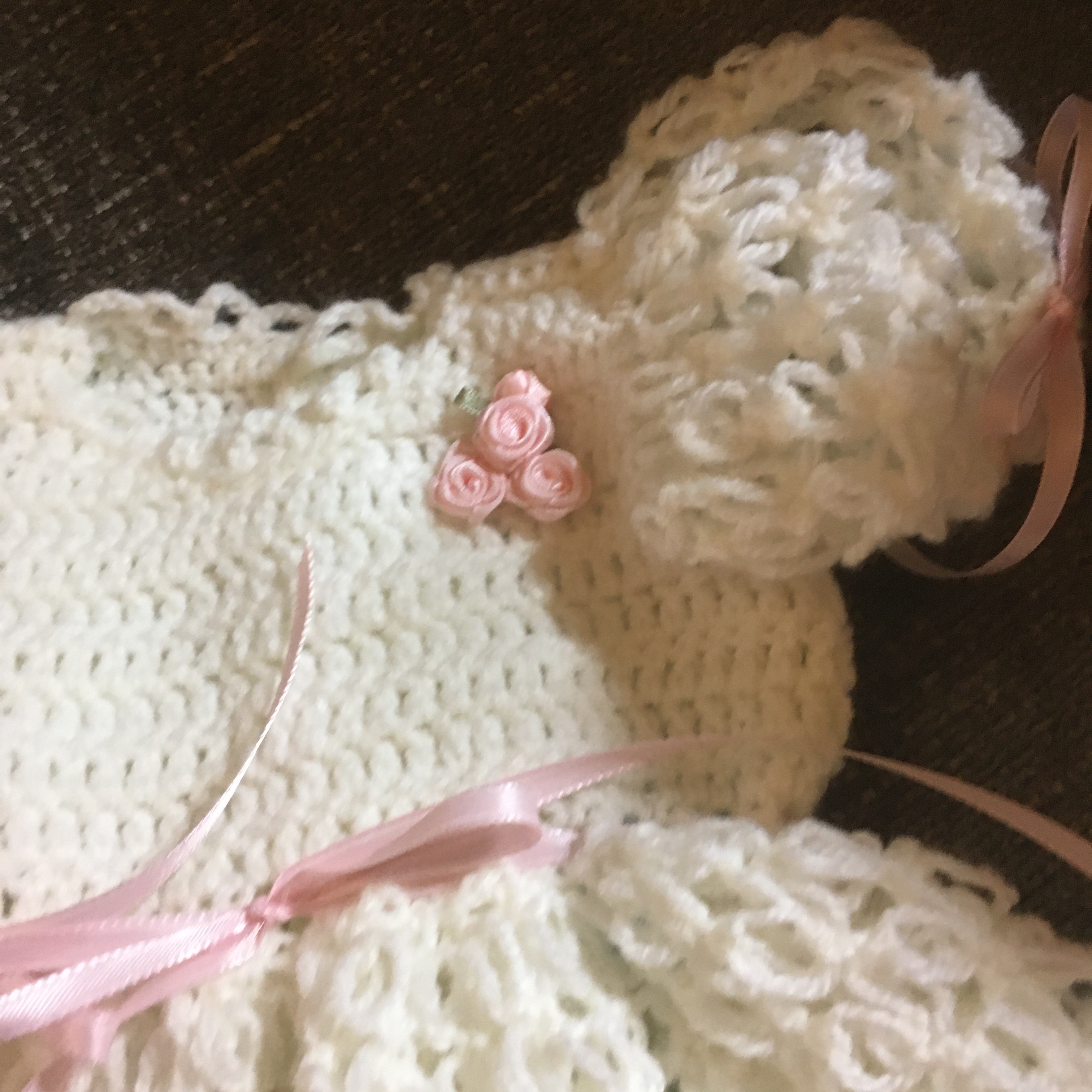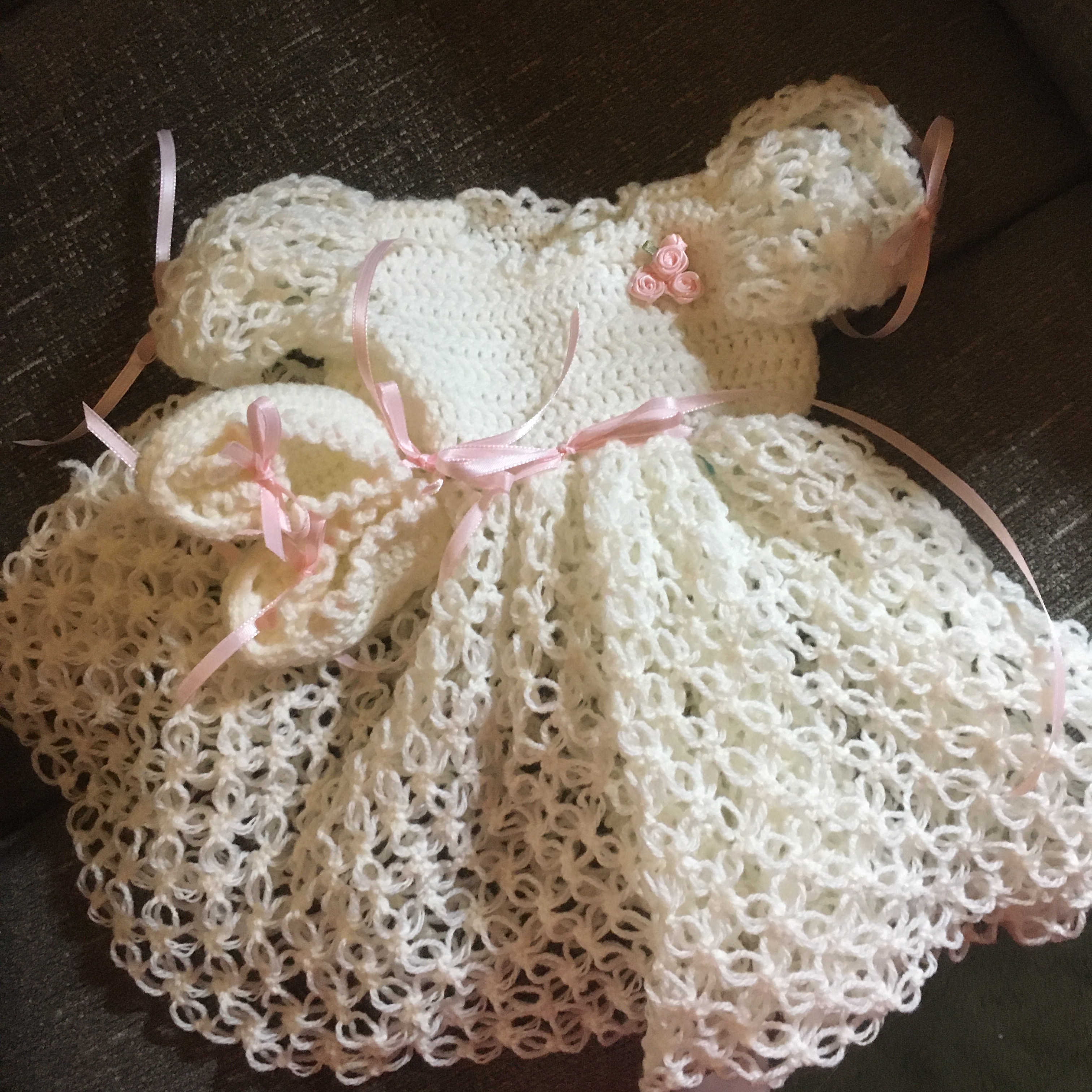 This dress is patterned after the dresses my other made for each eldest granddaughter in my siblings family. This one is hand crocheted from soft ivory acrylic yarn and dressed with double-sided satin ribbons. Both the dress and the booties are original designs and one-of-a-kind. This particular dress is for my friend, Alex, and her arriving daughter.